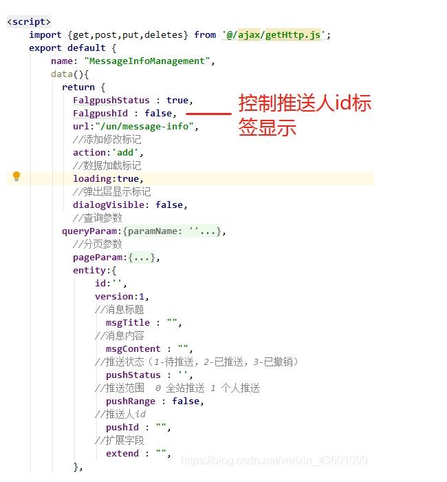下面的推送人id文本框,v-if=“FalgpushId”用来控制该文本框的显示,等于false时隐藏,true时显示(默认值为初始化时定义的FalgpushId = false,所以隐藏掉了)