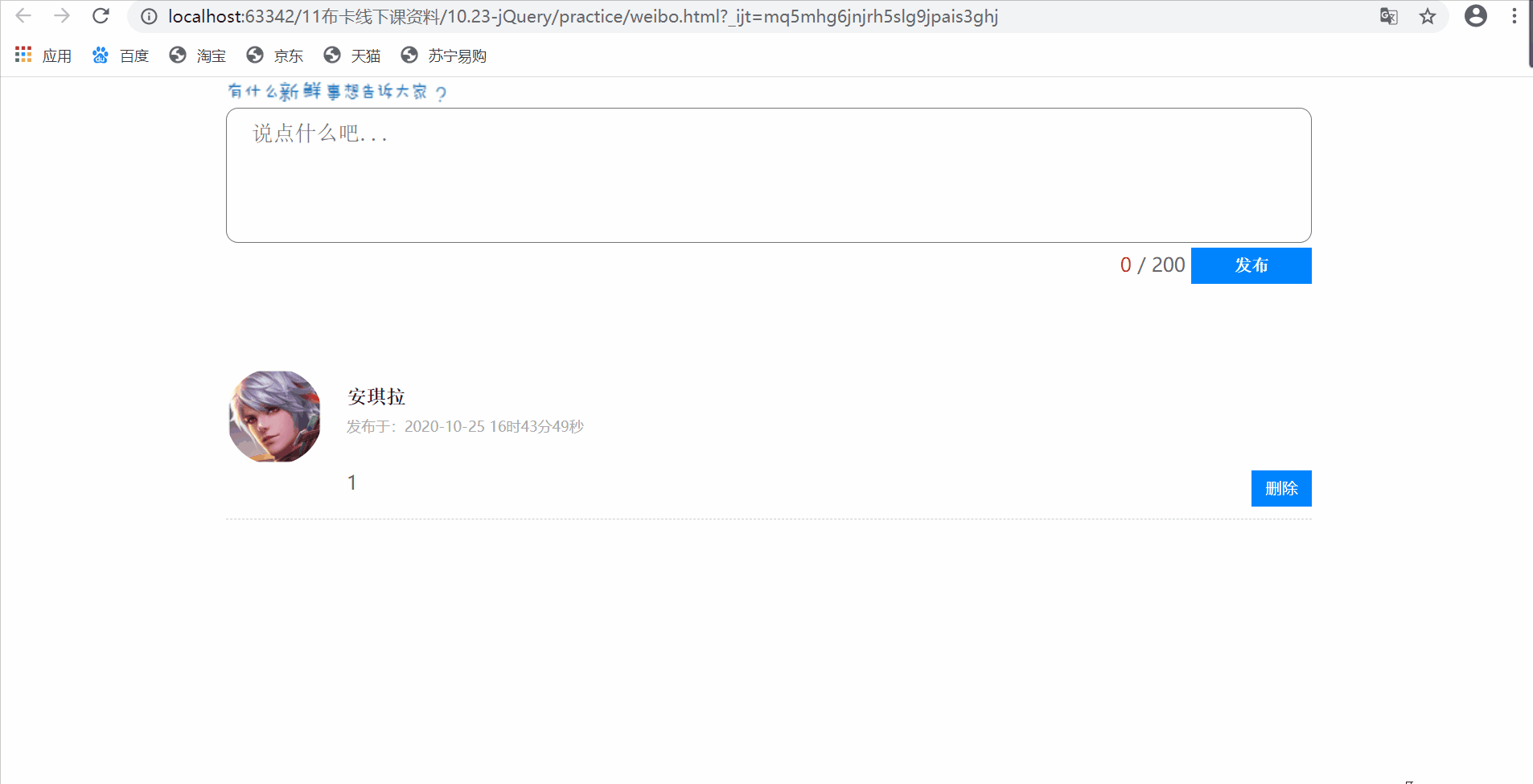 然后就是各种用on()绑定事件,还有动态创建的元素,要注意绑定事件的时机,事件处理无非就写了控制最大输入字符数,必须输入一些才能点击发布,文本框获得焦点和失去焦点激活或者禁用哪个按钮什么的等等。