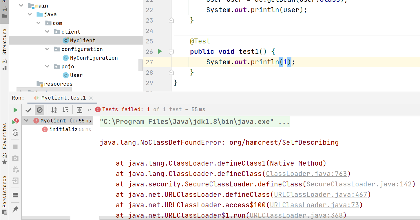 然后我们新建测试类测试,发现报了错