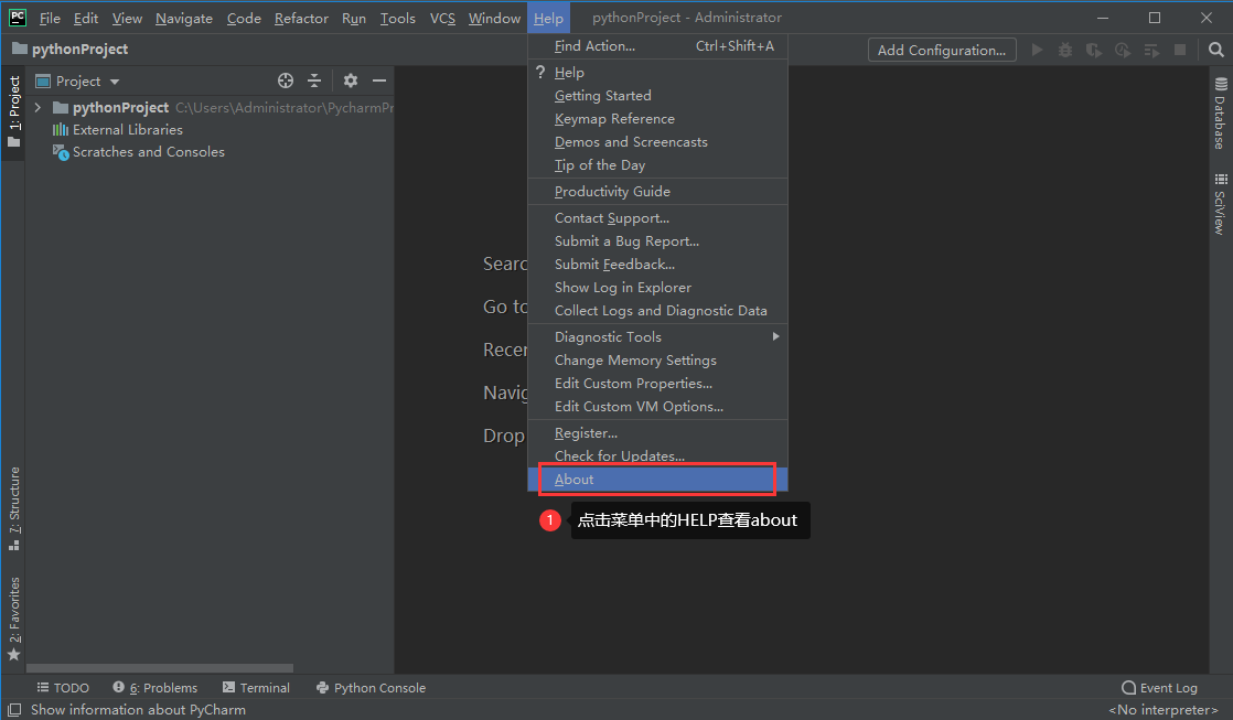 当你看到安装jetbrains-agent成功提示就说明已经激活成功了。进入PyCharm主界面点击“help”菜单中的“about”看看是否激活成功