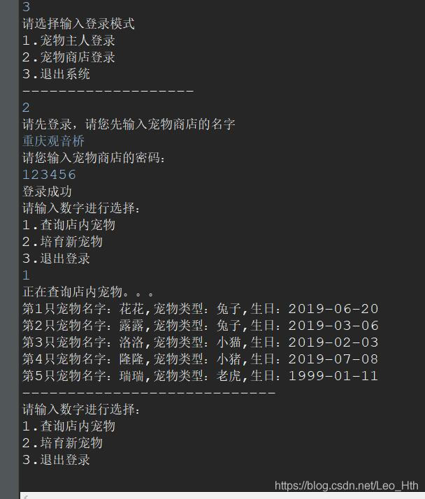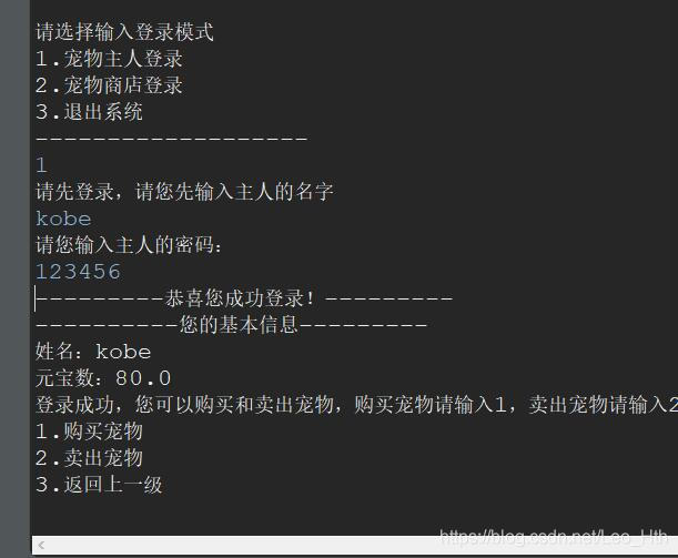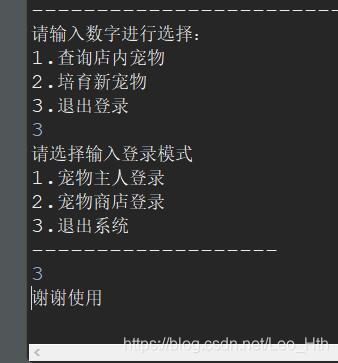 System.out.println("请选择输入登录模式\n1.宠物主人登录\n2.宠物商店登录\n3.退出系统\n-------------------");