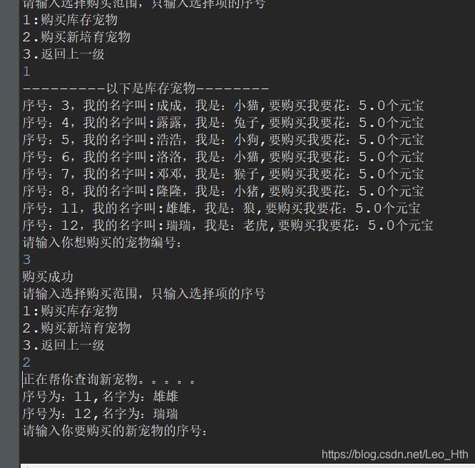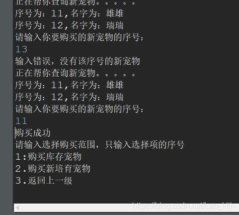 System.out.println("1:购买库存宠物\n2.购买新培育宠物\n3.返回上一级");