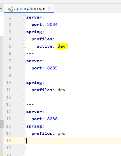 server: port: 8084---server: port: 8085spring: profiles: dev---server: port: 8086spring: profiles: pro---
