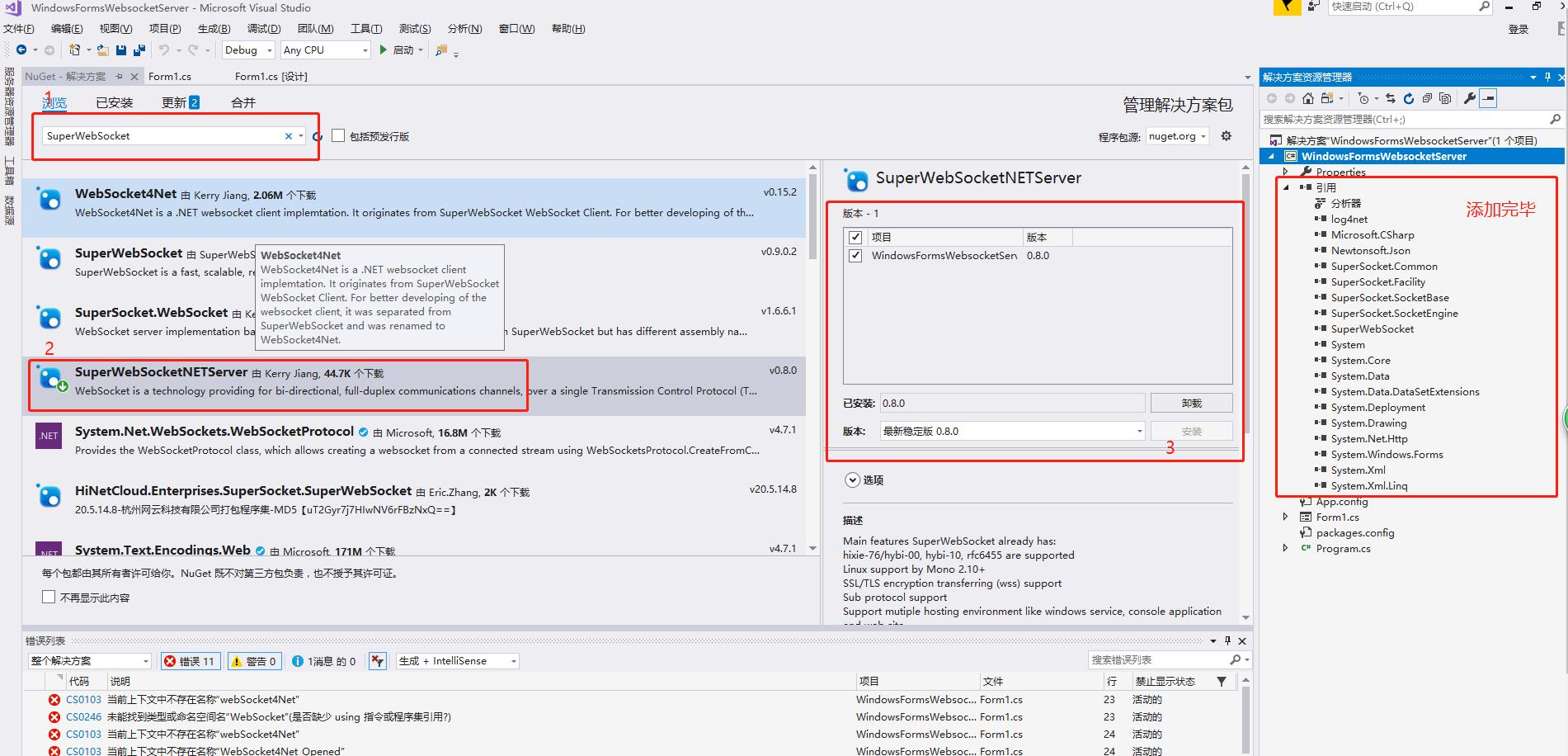 工具 -->Nuget包管理 -->管理解决方案的Nuget程序包 -->搜索 SuperWebSocket ,选择SuperWebSocketNETServer,点击右侧 安装,等待安装完成,安装完成以后,项目会多出很多引用库,如下