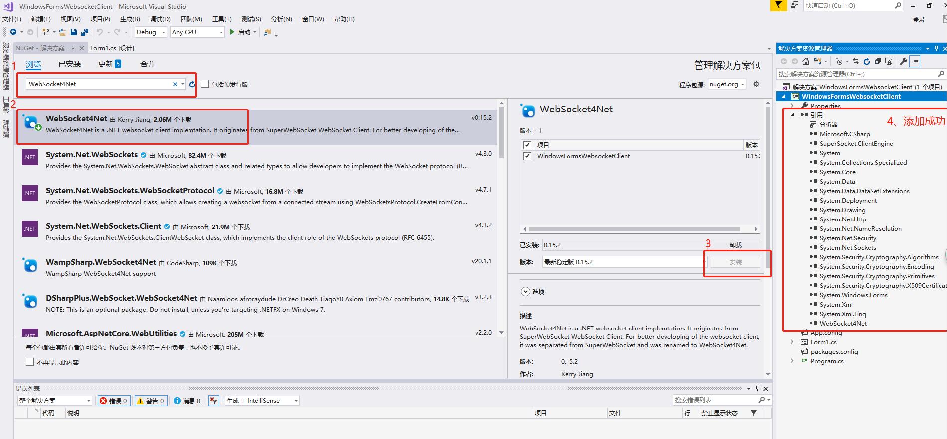 工具 -->Nuget包管理 -->管理解决方案的Nuget程序包 -->搜索 WebSocket4Net ,选择WebSocket4Net,点击右侧 安装,等待安装完成,安装完成以后,项目会多出很多引用库,如下