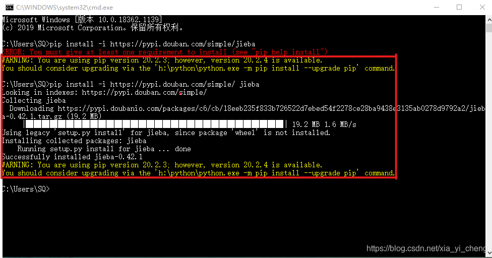 速度实在太快了,我们可以看到19.2M大小的 jieba 库20几秒就安装好了,当然这也要取决当地的网速,如果