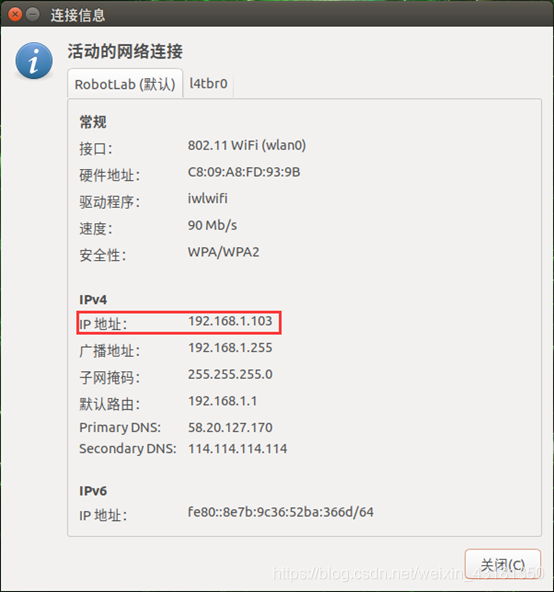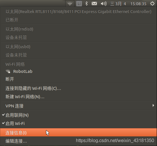点击桌面右上角的WiFi图标,找到“连接信息”点开就可以看到当前网络连接的IP地址了