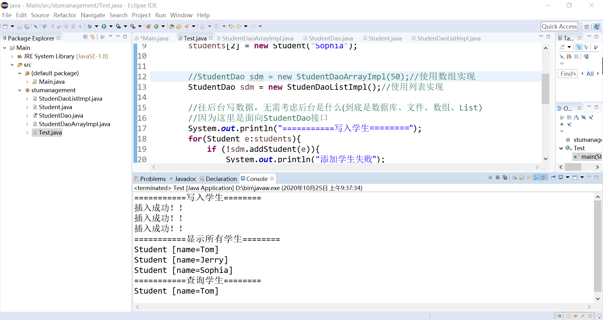 StudentDaoArraylmpl与StudentDaoListImpl都是使用DAO接口来实现操作的,这样可以实现不相关类的相同行为,也可以更加灵活地调用定义函数,使得程序结构清晰,并且此时相同的方法有不同的实现,在选择适合的存储方式和方法时,对代码的改动也较小,灵活性较高,增强了程序的稳定性,好处多多。