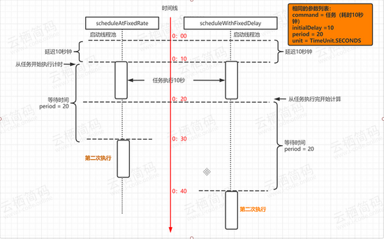 scheduleAtFixedRate 是以任务开始的时间为时间起点来计时,时间到就执行第二次任务,与任务执行所花费的时间无关;而 scheduleWithFixedDelay 是以任务执行结束的时间点作为计时的开始。如下所示