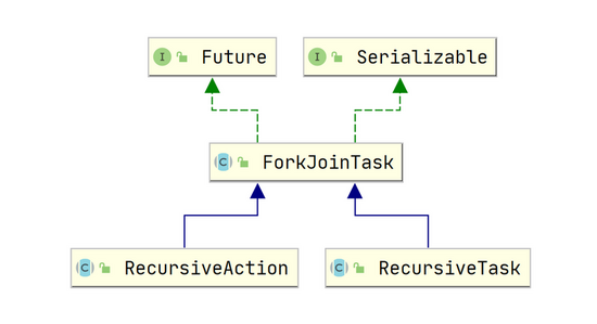 ForkJoinPool 的使用也是通过调用 submit(ForkJoinTask<T> task) 或 invoke(ForkJoinTask<T> task) 方法来执行指定任务了。其中任务的类型是 ForkJoinTask 类,它代表的是一个可以合并的子任务,他本身是一个抽象类,同时还有两个常用的抽象子类 RecursiveAction 和 RecursiveTask ,其中 RecursiveTask 表示的是有返回值类型的任务,而 RecursiveAction 则表示无返回值的任务。下面是它们的类图: