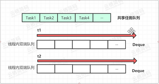 通过 ForkJoinPool 可以极大的发挥多核处理器的优势,尤其非常适合用于递归的场景,例如树的遍历、最优路径搜索等场景。 上面说的是 ForkJoinPool 的使用上的,下面我们来说一下其内部的构造,对于我们前面说的几种线程池来说,它们都是里面只有一个队列,所有的线程共享一个。但是在 ForkJoinPool 中,其内部有一个共享的任务队列,除此之外每个线程都有一个对应的双端队列 Deque , 当一个线程中任务被 Fork 分裂了,那么分裂出来的子任务就会放入到对应的线程自己的 Deque 中,而不是放入公共队列。这样对于每个线程来说成本会降低很多,可以直接从自己线程的队列中获取任务而不需要去公共队列中争夺,有效的减少了线程间的资源竞争和切换。