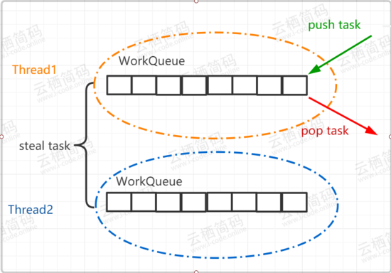 有一种情况,当线程有多个如 t1,t2,t3... ,在某一段时间线程 t1 的任务特别繁重,分裂了数十个子任务,但是线程 t0 此时却无事可做,它自己的 deque 队列为空,这时为了提高效率, t0 就会想办法帮助 t1 执行任务,这就是“ work-stealing ”的含义。 双端队列 deque 中,线程 t1 获取任务的逻辑是后进先出,也就是 LIFO(Last In Frist Out) ,而线程 t0 在“ steal ”偷线程 t1 的 deque 中的任务的逻辑是先进先出,也就是 FIFO(Fast In Frist Out) ,如图所示,图中很好的描述了两个线程使用双端队列分别获取任务的情景。你可以看到,使用 “ work-stealing ” 算法和双端队列很好地平衡了各线程的负载。