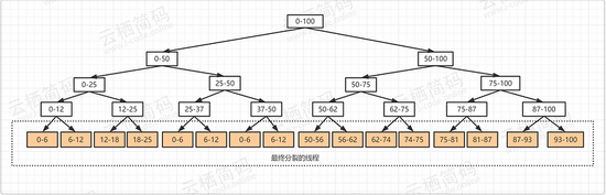 从上面的案例我们可以看到我们,创建了很多个线程执行,因为我测试的电脑是12线程的,所以这里实际是创建了12个线程,也侧面说明了充分调用了每个处理的线程处理能力 上面案例其实我们发现很熟悉的味道,那就是以前接触过的递归思想,将上面的案例图像化如下,更直观的看到,