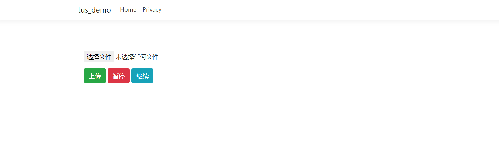 关于此协议实现原理这里不做阐述,请参照上述github地址自行了解,本文只是给出.NET Core方案下的基本demo,我们上传一个大文件然后通过进度显示上传进度以及对上传可暂停可继续,专业点讲就是断点续传,首先肯定是引入tus脚本和需要用到的bootstrap样式,我们将进度条默认隐藏,当上传时才显示,所以我们给出如下HTML。