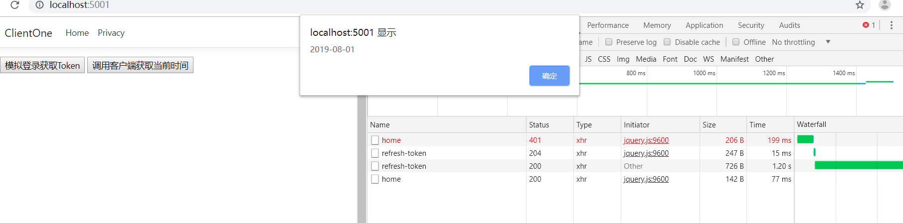 什么是刷新令牌呢?刷新访问令牌是用来从身份认证服务器交换获得新的访问令牌,有了刷新令牌可以在访问令牌过期后通过刷新令牌重新获取新的访问令牌而无需客户端通过凭据重新登录,如此一来,既保证了用户访问令牌过期后的良好体验,也保证了更高的系统安全性,同时,若通过刷新令牌获取新的访问令牌验证其无效可将受访者纳入黑名单限制其访问,那么访问令牌和刷新令牌的生命周期设置成多久合适呢?这取决于系统要求的安全性,一般来讲访问令牌的生命周期不会太长,比如5分钟,又比如获取微信的AccessToken的过期时间为2个小时。接下来我将用两张表来演示实现刷新令牌的整个过程,可能有更好的方案,欢迎在评论中提出,学习,学习。我们新建一个http://localhost:5000的WebApi用于身份认证,再新建一个http://localhost:5001的客户端,首先点击【模拟登录获取Toen】获取访问令牌和刷新令牌,然后点击【调用客户端获取当前时间】,如下: