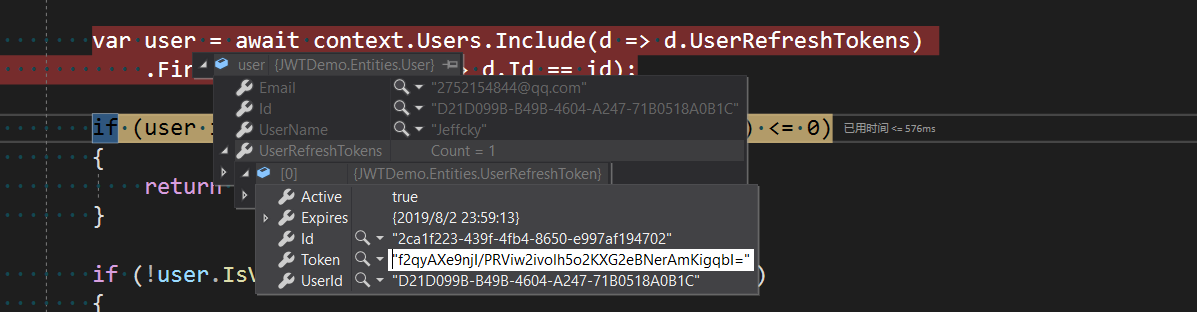 我们看到在添加刷新令牌时,用户Id是有值的,对不对,这是为何呢?究其根本问题出在我们移除刷新令牌方法中,如下: