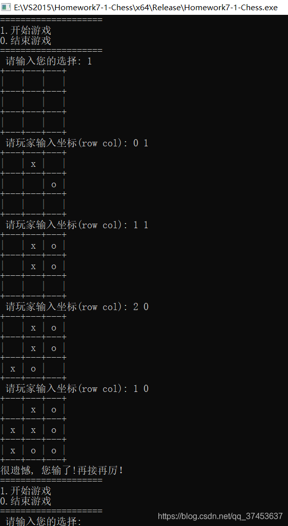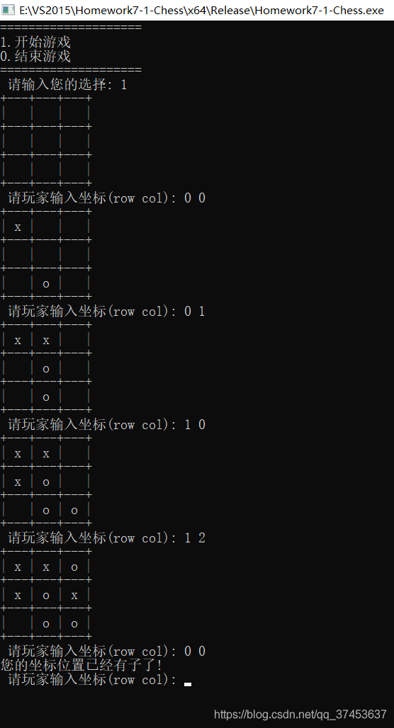3、玩家落子(玩家通过输入行列坐标的方式来落子)。