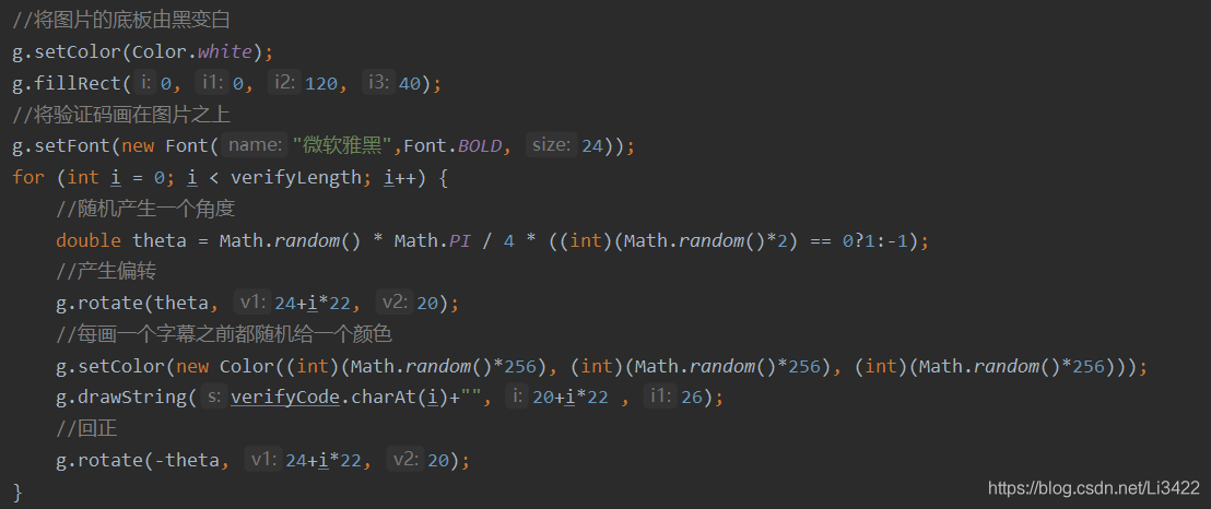 设置图片的底色,并用setFont函数将验证码画在图片上,如果想让验证码难一点,可以添加for循环的代码给图片增加旋转角度