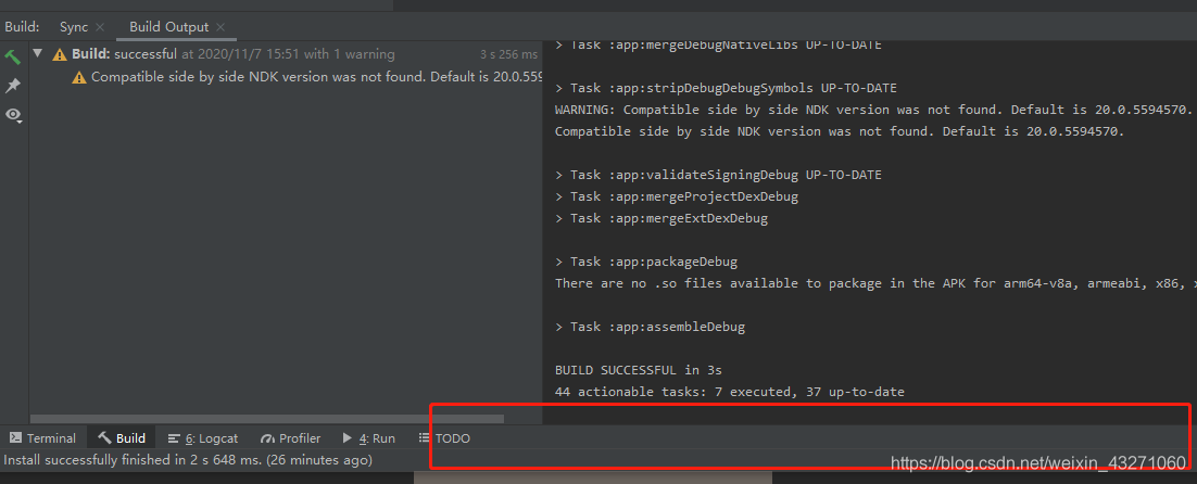 注意:前提是创建出来的空的Android项目下方没有任何报错才可以,像下图一样