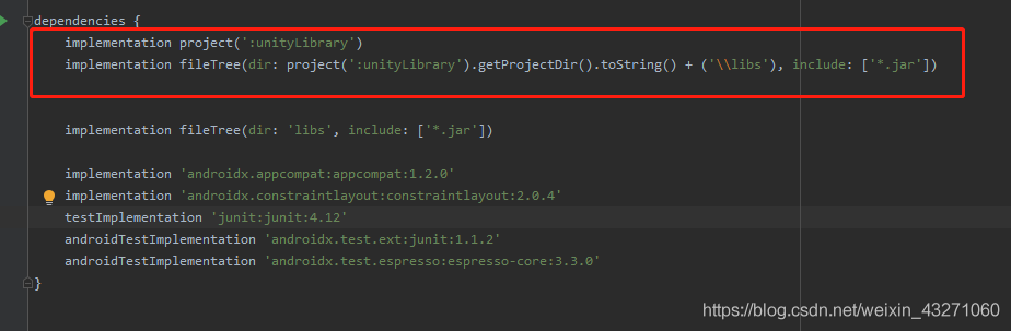 implementation fileTree(dir: project(':unityLibrary').getProjectDir().toString() + ('\\libs'), include: ['*.jar'])