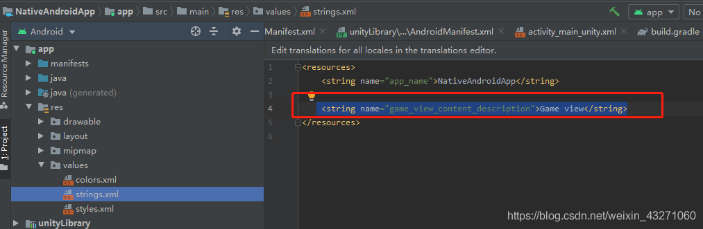 选择 NativeAndroidApp 的 strings.xml 添加