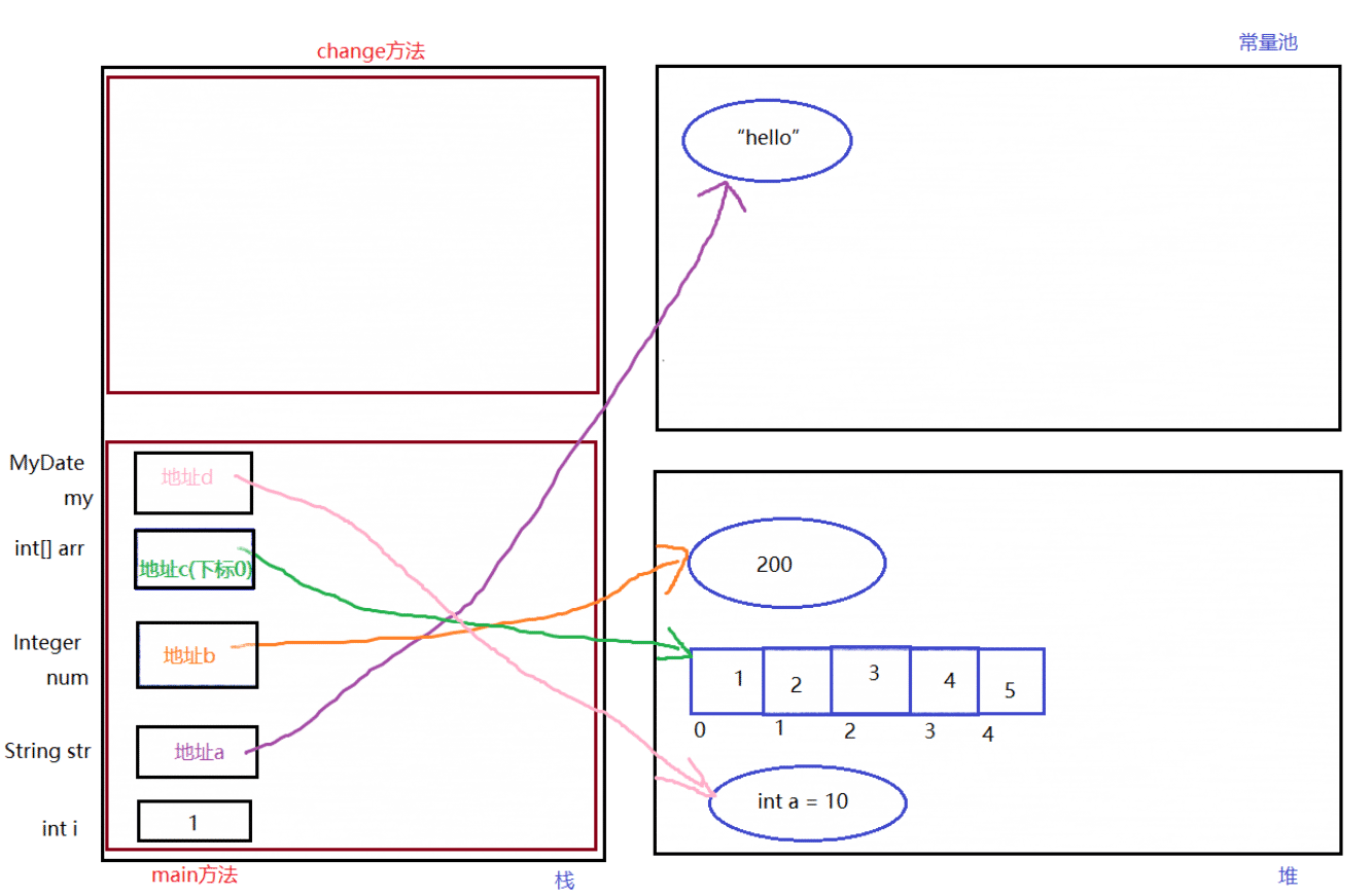 1.初始时,栈中有main方法与change方法,在main方法中各个元素进行了初始化。