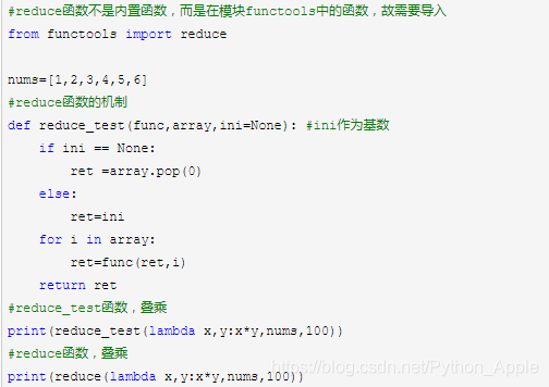 reduce函数也是一个参数为函数,一个为可迭代对象的高阶函数,其返回值为一个值而不是迭代器对象,故其常用与叠加、叠乘等