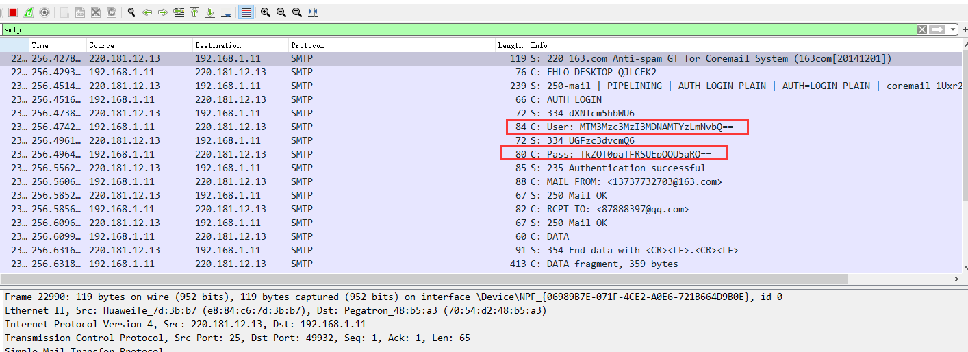 smtp发送抓包如下,可以看到发送时用户名密码是加密的
