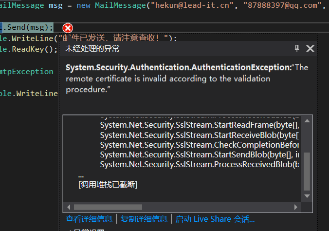 Console.WriteLine("发送邮件失败:" + ex.Message);//输出错误信息