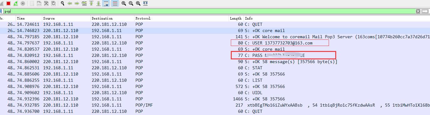 下面只能贴上163服务器不加密的发送过程与接收过程的wireshark抓包,忘记密码的同学可以自己抓包找回密码,仅限在不加密的情况下。