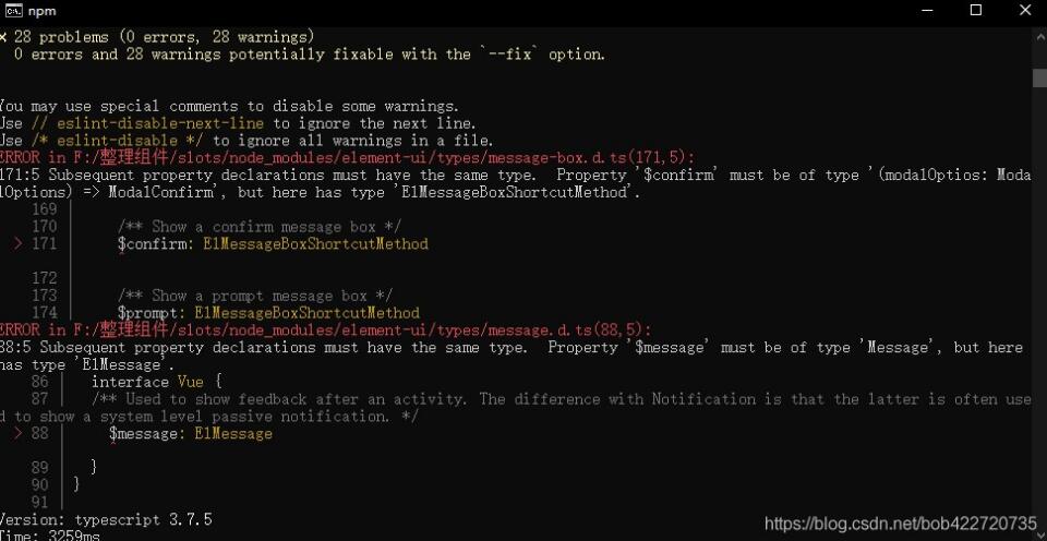 我搜索了很多的解决方案,都不符合,我发现它爆错的地方是两个的类型描述文件冲突了,这时候我把node_modules/element-ui/types/message-box.d.ts 和 node_modules/element-ui/types/message.d.ts 相关地方注释后再打包果然不报错了。
