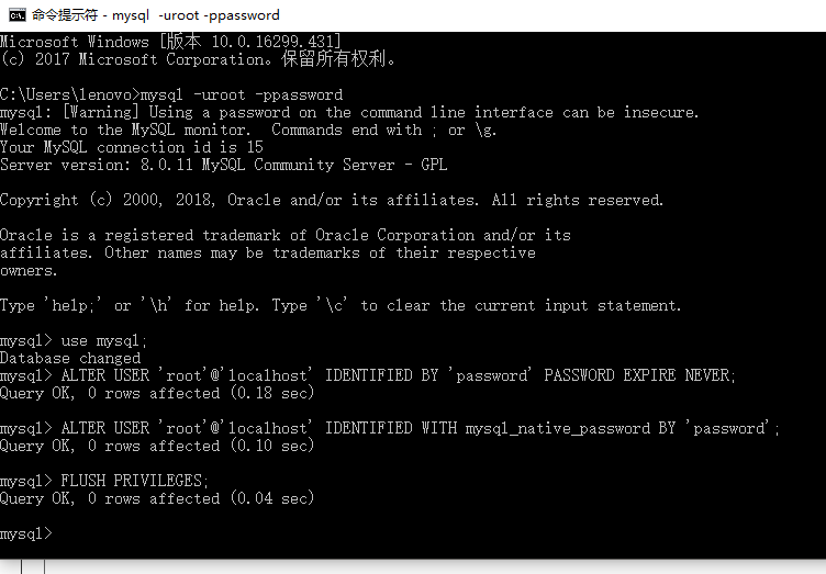mysql -uroot -ppassword #登录 use mysql; #选择数据库 # 远程连接请将'localhost'换成'%' ALTER USER 'root'@'localhost' IDENTIFIED BY 'password' PASSWORD EXPIRE NEVER; #更改加密方式 ALTER USER 'root'@'localhost' IDENTIFIED WITH mysql_native_password BY 'password'; #更新用户密码 FLUSH PRIVILEGES; #刷新权限