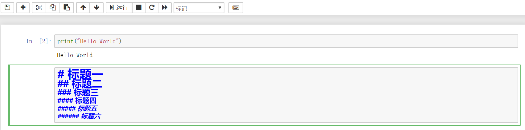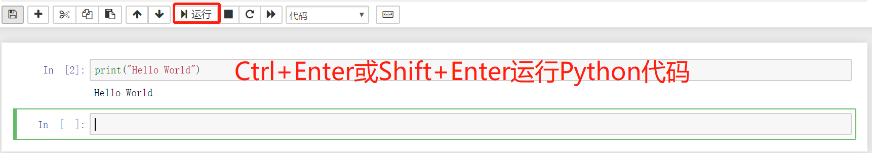 在cell单元格中进行输入Python代码,可以点击运行按钮可以看到运行结果,也可以使用快捷键Ctrl+Enter运行Python代码,或使用Shift+Enter运行Python代码并跳到下一行