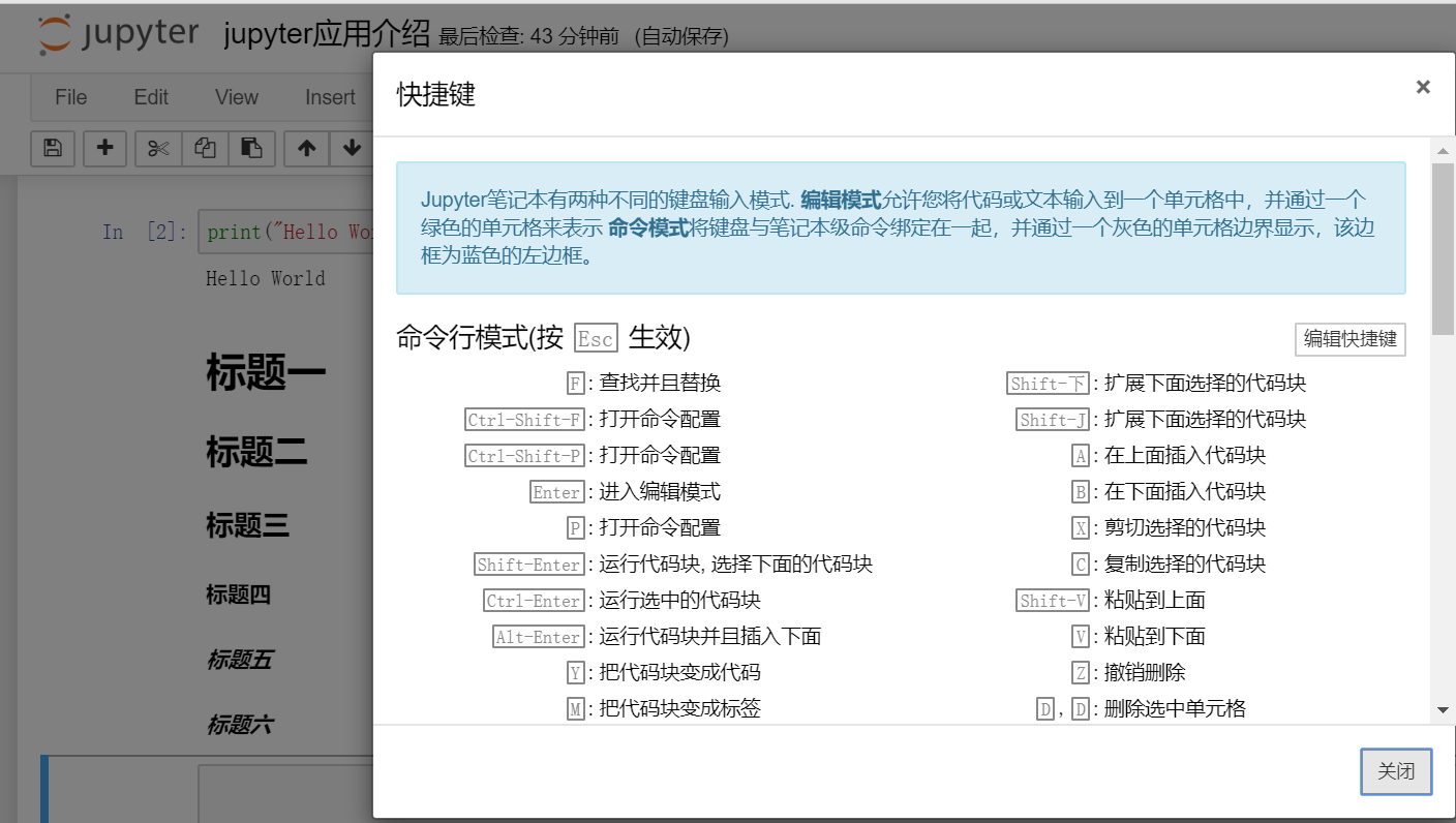 jupyter notebook也提供了很多快捷键可供我们进行使用,提高我们的工作效率,可以通过esc+H进行查看常用快捷键