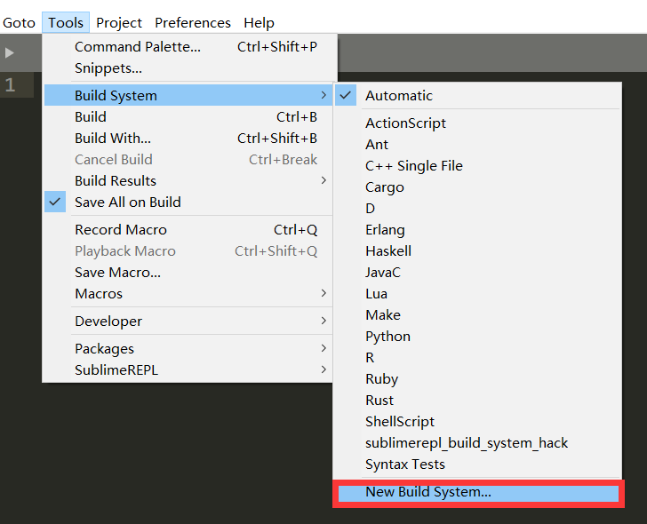 1、打开Sublime Text 3菜单Tools > Build System > New Build System..
