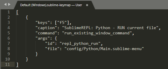 1、安装SublimeREPL插件后,打开Preferences->Key Bindings,添加快捷键: