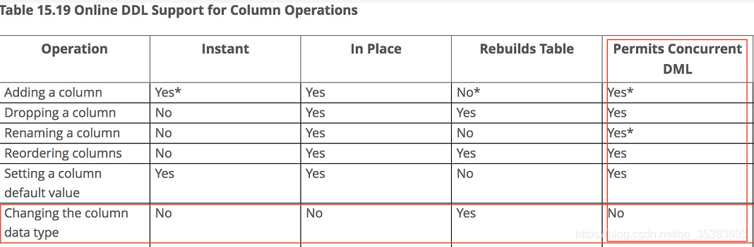 如图所示,对于修改数据类型这种操作,是不支持并发的DML操作!也就是说,如果你直接使用ALTER这样的语句在线修改表数据结构,会导致这张表无法进行更新类操作(DELETE、UPDATE、DELETE)。