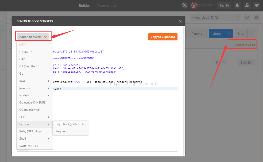 POSTMAN还有一个很赞的地方就是导出用例为CODE,即如果你编写好了用例之后可以通过点击“Generate Code”来一键生成代码,并且还有好多语言和类库可以选择,帧的是棒棒哒!