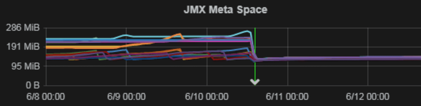 • 目前主要是通过修改JVM的-XX:SoftRefLRUPolicyMSPerMB值来解决metaspace上升问题,后续会持续观察变化,适当调整参数。至于这个参数之前为什么会被设置成0, 还需要找ops确认下。