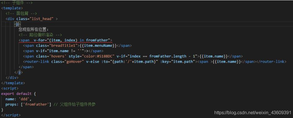 子组件是封装好的一个例子,而父组件是每一个页面,页面中需要用到面包屑时就引入