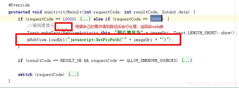 不过问题在于WebViewClient的shouldOverrideUrlLoading方法返回对象是boolean类型,那么,我们需要返回的是图片路径或者图片本身,也可以是base64处理过的流,这个类型的返回值对我们没有太多意义,所以设置一个全局变量imageUri,在拍照之前给其赋值,在回调时就利用这个路径可以得到想要的所有格式的图片数据了。