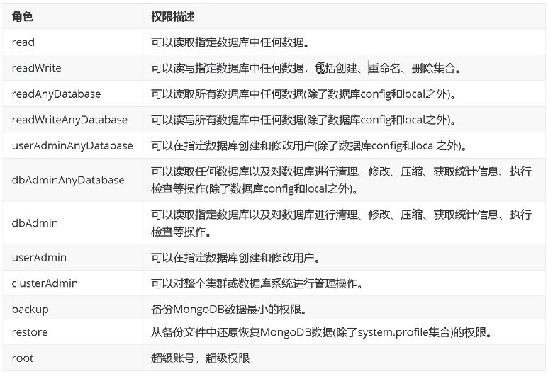 mongodb默认内置了一些角色,不同的角色拥有不同的权限,如下图