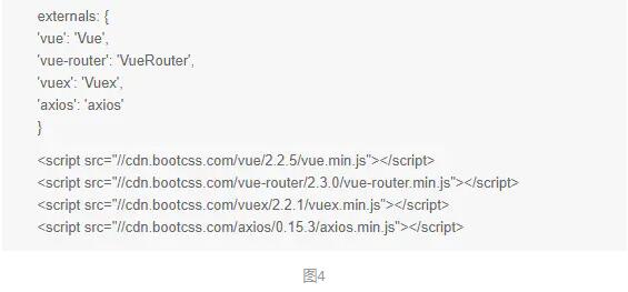 这里建议使用cdn 然后在build里找到webpack.base.conf,加入平常不改动的库,如图4所示,然后在入口页面index.html导入相应的cdn
