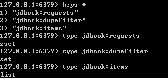 其中,jdbook:requests 中保存了待爬取的Request对象;jdbook:dupefilter 中保存了已经爬取过的Request对象的指纹;jdbook:items中保存了爬取到的Item对象。