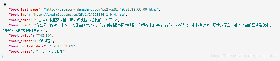 命令执行完后稍等片刻DangdangSpider便会开始爬取数据,爬取到的数据结构如下图所示: