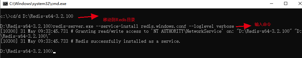 注:使用Redis命令时,需要在先将目录跳转到Redis所在文件夹,如【cd/d D:\Redis-x64-3.2.100】