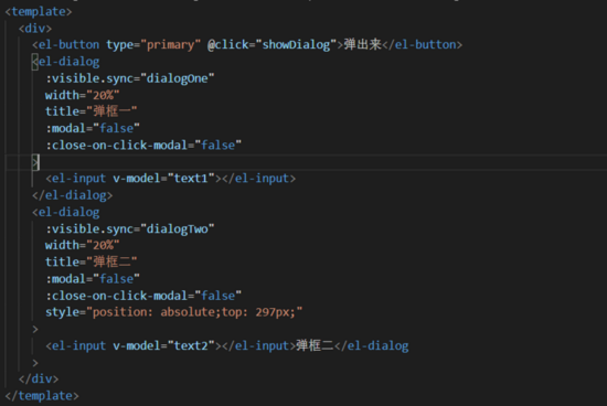 总的思路就是:dialog先后顺序重叠问题,使用便宜去让它们错开;然后就是遮罩层导致不能点击z-index层级低的弹框,就要用到modal去关闭z-index层级高的遮罩层。(还可以额外使用close-on-click-modal来取消通过点击 modal 关闭 Dialog)