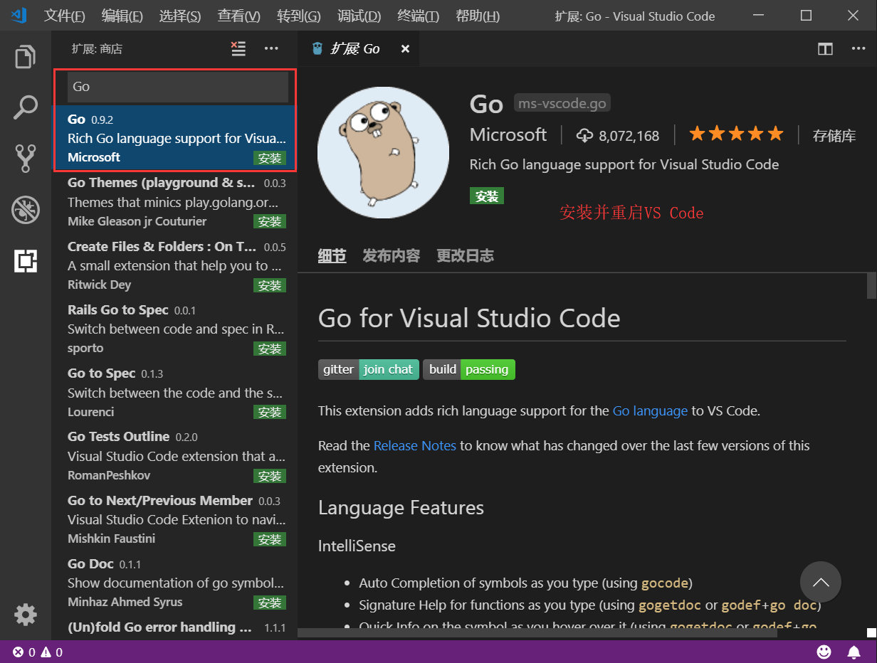现在我们要为我们的VS Code编辑器安装Go扩展插件,让它支持Go语言开发。