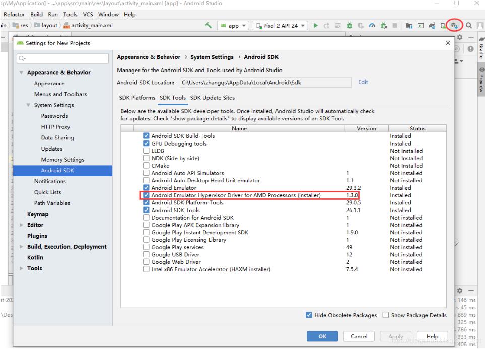 在网上一搜,说是Android Studio已经支持AMD CPU的,后面在Android SDK配置项中终于发现有这么一项。