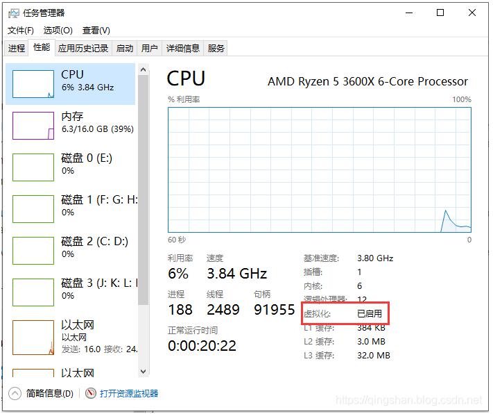 1.开机进入BIOS,设置CPU开启虚拟化。是否开启,可以通过任务管理器确定。